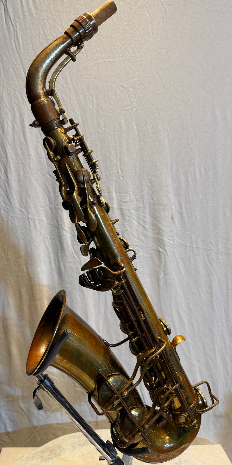 De saxofoon heeft een authentieke natuurlijke patina. De oorspronkelijke lak is grotendeels verdwenen, wat zorgt voor een eerlijke vintage uitstraling met veel karakter. Geen herlak – volledig origineel.